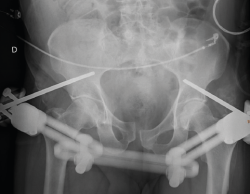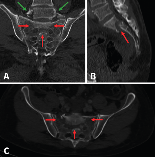 Spinopelvic dissociation is a rare and infrequent injury. It is associated with high-energy trauma. It happens when axial compression forces impact the spine against the sacrum. Transverse sacral fracture associated with two sagittal fractures in both sacral wings cause the disconnection between the spine and the pelvic ring. It is a serious and potentially unstable injury that causes neurological damages in most cases and can leave long-term sequelae if we don’t diagnose quickly and act correctly. There is a consensus nowadays that the best option to treat these injuries is surgery, being the lumbopelvic fixation the first choice. The final outcomes in the medium-long term will be fundamentally conditioned by the presence of neurological sequelae.