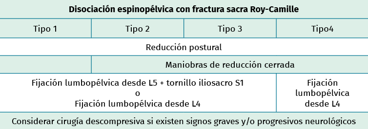 La disociación espinopélvica es una lesión rara e infrecuente. Está asociada a traumatismos de alta energía donde existe una compresión axial del raquis sobre el sacro. Se produce a consecuencia de una fractura transversa sacra asociada a dos fracturas sagitales en ambas alas sacras que provocarían la desconexión entre el raquis y el anillo pélvico. Se trata de una lesión grave y potencialmente inestable que provoca afectación neurológica en la mayoría de los casos y puede dejar secuelas a largo plazo si no se diagnostica a tiempo y no se actúa de manera correcta. Parece existir consenso actualmente en que el tratamiento de estas lesiones es quirúrgico, siendo la fijación lumbopélvica el tratamiento ideal. El resultado final a medio y largo plazo vendrá condicionado fundamentalmente por la presencia de secuelas neurológicas.