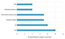 Resultados: del total de 21 pacientes, 2 fueron descartados para este estudio por demostrarse que no padecían COVID-19. De los 19 pacientes restantes, todos ellos con afectación pulmonar severa establecida, 10 eran hombres y 9 mujeres, con un rango de edad entre 65 y 95 años. Fallecieron 7 pacientes (37%), de los cuales 6 tenían 3 o más comorbilidades.