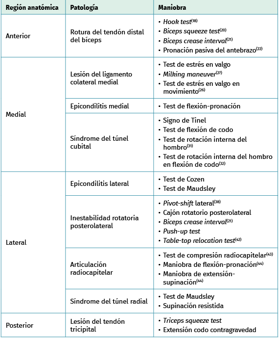El dolor en la región del codo es un motivo de consulta muy habitual en pacientes en edad laboral, tanto a consecuencia de eventos traumáticos como repetitivos. La estrecha relación entre sus estructuras anatómicas hace que en ocasiones resulte complicado obtener un diagnóstico preciso. En el siguiente texto se explicarán los conceptos anatómicos y biomecánicos más relevantes y la exploración física detallada que debemos conocer para llevar a cabo el diagnóstico de la patología del codo.