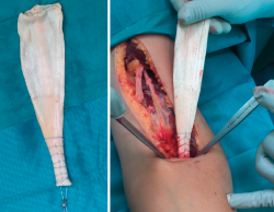 En casos de rotura crónica del bíceps distal, la combinación de la atrofia muscular, la retracción y la fibrosis hace que la reinserción anatómica primaria del tendón sea frecuentemente imposible. Para recuperar la longitud del tendón y evitar contracturas en flexión, la reconstrucción con aumento de injerto se ha propuesto como una alternativa para los casos no susceptibles de reparación primaria. Describimos uno de los dos casos en que hemos utilizado un aloinjerto de Aquiles a través de un vía de Henry modificada para reconstruir el tendón distal del bíceps. Mejorar las molestias, recuperar longitud y restaurar al menos parcialmente la fuerza de flexión y supinación eran nuestros objetivos. Consideramos que estas lesiones crónicas del bíceps distal se pueden reconstruir de forma segura y eficaz utilizando un aloinjerto de Aquiles.