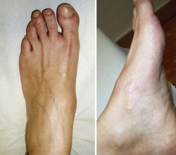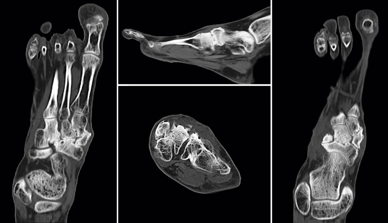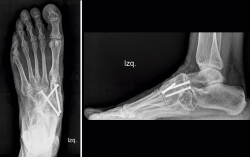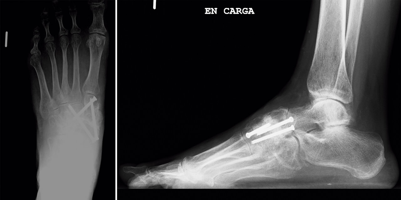 Caso clínico: paciente de 53 años que consulta por dolor y deformidad en mediopié izquierdo instaurado en los últimos meses. Las pruebas complementarias realizadas mediante radiología simple, tomografía computarizada y gammagrafía mostraron una pseudoartrosis en la rama medial de la osteotomía.