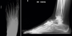 Case report: 53 year old patient reporting pain and deformity in her left midfoot during the last few months. Complementary studies were done such as x-ray, computed tomography and gammagraphy, which showed a pseudoarthrosis in the medial section of the osteotomy.